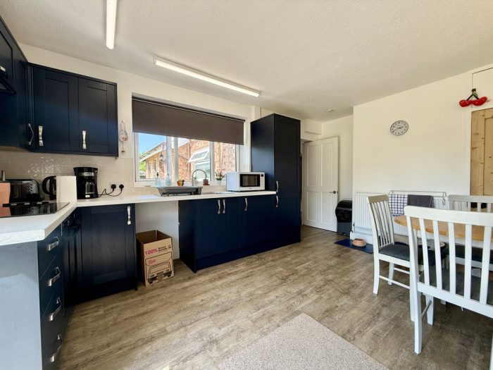 KITCHEN / BREAKFAST ROOM 14' 11" x 11' 1" (4.55m x 3.38m) UPVC side entrance door; l-shaped worktop with a range of base cupboards and drawers; built in oven with four ring hob; space and plumbing for washing machine; shelved larder cupboard; one bowl sink with mixer tap; range of wall units; understairs storage cupboard; further built in storage cupboard; radiator.
