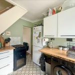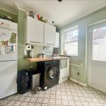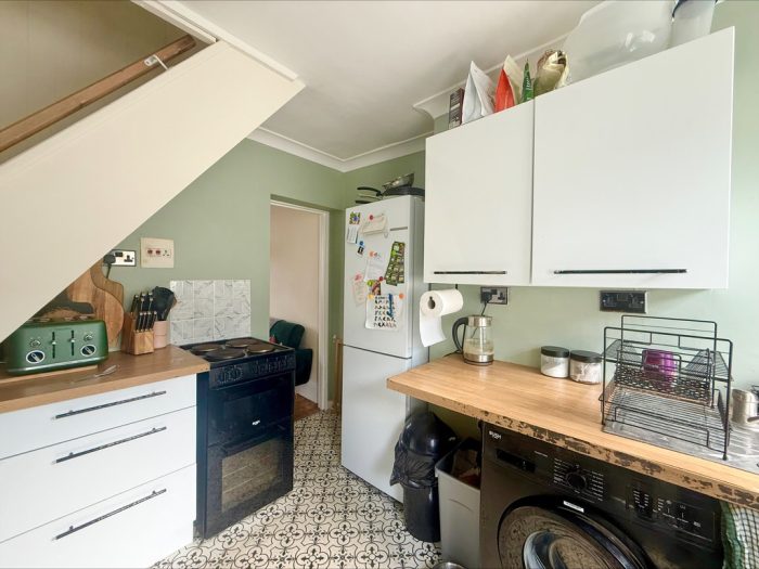 KITCHEN 9' 6" minus stairwell x 10' (2.9m x 3.05m) fitted with a range of wall and base units with square edge worksurfaces over; inset stainless steel single drainer sink with mixer tap; plumbing for washing machine; electric cooker point; space for electric cooker; stairs to first floor landing; upvc double glazed window to rear; upvc double glazed door to rear.