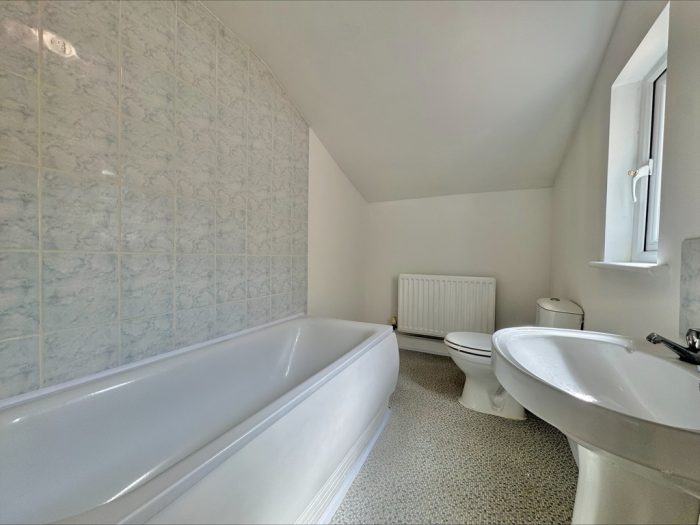 BATHROOM bath with mixer tap and wall mounted shower; wc; hand wash basin; upvc double glazed window to side aspect.