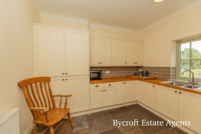 KITCHEN 11' 5" x 9' 4" max (3.48m x 2.84m) fitted kitchen with solid wood worksurfaces; stainless steel sink and tiled splashbacks with views of formal gardens.