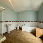 BATHROOM bath; WC; pedestal wash hand basin; shower cubicle; frosted side window; radiator; extractor fan.