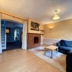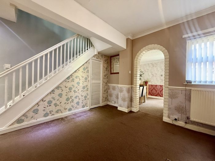 LOUNGE 14' 8" x 12' 10" (4.47m x 3.91m) upvc entrance door into lounge; window to front aspect,; brick fireplace, radiator; wall lights; large opening through to;