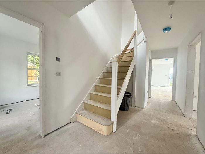 ENTRANCE HALL 18' max x 7' 7" max (5.49m x 2.31m) minus stairwell; stairs to first floor landing; upvc door to front flanked by double glazed windows to front.