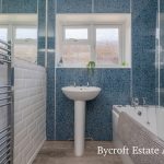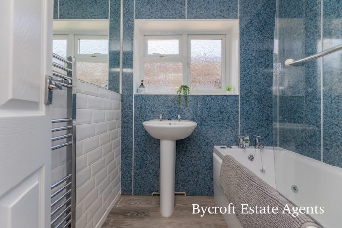 BATHROOM pedestal wash hand basin; spa bath with electric shower fittings, shower screen; chrome heated towel rail; frosted double glazed window; downlights.