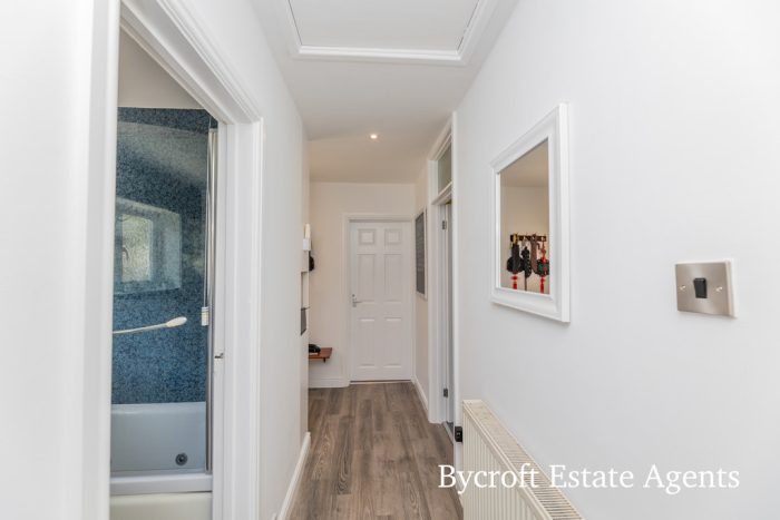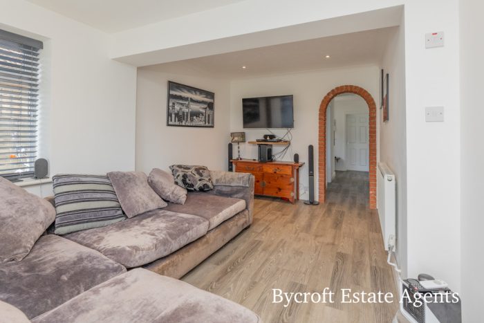 ENTRANCE HALL upvc entrance door leading to l-shaped entrance hall, access to roof space; radiator; storage cupboard; brick open arch through to: