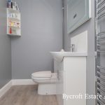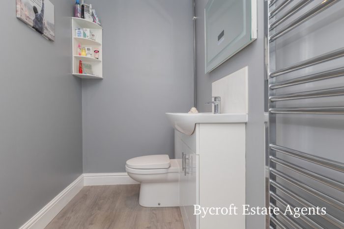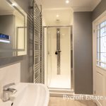 EN SUITE SHOWER ROOM spacious shower room comprising wash hand basin with mixer tap and storage cupboard under; wc with push button cistern; large shower cubicle with mains fittings and two shower heads; chrome heated towel rail; downlights.