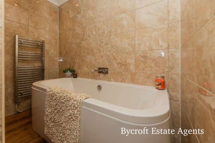 BATHROOM 10' 7" x 8' 9" (3.23m x 2.67m) fitted with a white suite comprising of a vanity wash hand basin with mixer tap and storage drawers; low level wc; double ended panelled bath with mixer tap; fully tiled walls; two heated towel rail radiators; wall mounted mirror; UPVC double glazed window to rear.