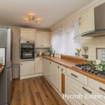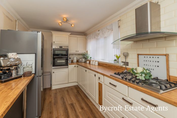 KITCHEN 16' 4" x 8' 2" (5m x 2.49m) fitted with a range of wall and base units with square edge worksurfaces over; inset one and a half bowl sink with mixer tap; inset five ring gas hob with cooker hood over; built in double electric oven; integrated 45mm dishwasher; space for fridge freezer; plumbing for automatic washing machine; tiled splashbacks; breakfast bar; two UPVC double glazed windows to front; walk in storage cupboard.