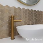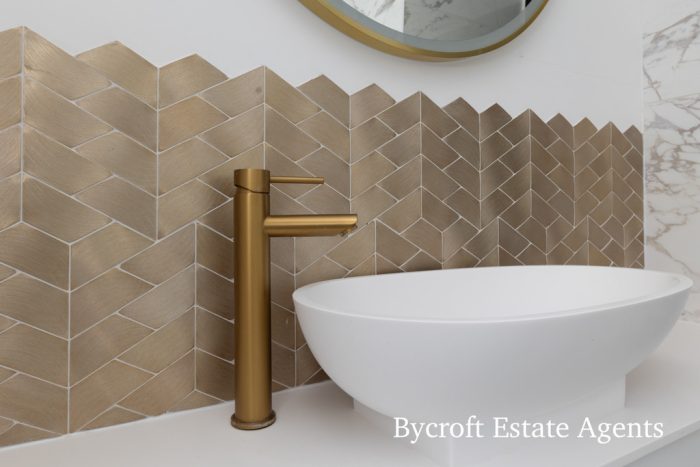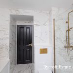 SHOWER ROOM spacious; newly installed suite; comprising vanity unit with wash hand basin with matt gold mixer tap and storage cupboards under; wc with concealed push button cistern; large walk in shower with two shower heads; upright storage cupboard housing the Worcester gas boiler; frosted rear window; radiator; down lights.