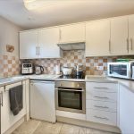 KITCHEN 9' 8" x 5' 11" (2.95m x 1.8m) fitted with a modern range of base and wall units with square edge work surfaces over; inset stainless steel sink with mixer tap over; inset electric hob with cooker hood over; built in electric oven; plumbing for automatic washing machine; space for fridge freezer; tiled splashbacks; remote controlled under unit lighting; double glazed window to front.