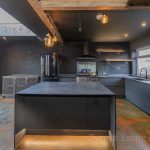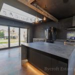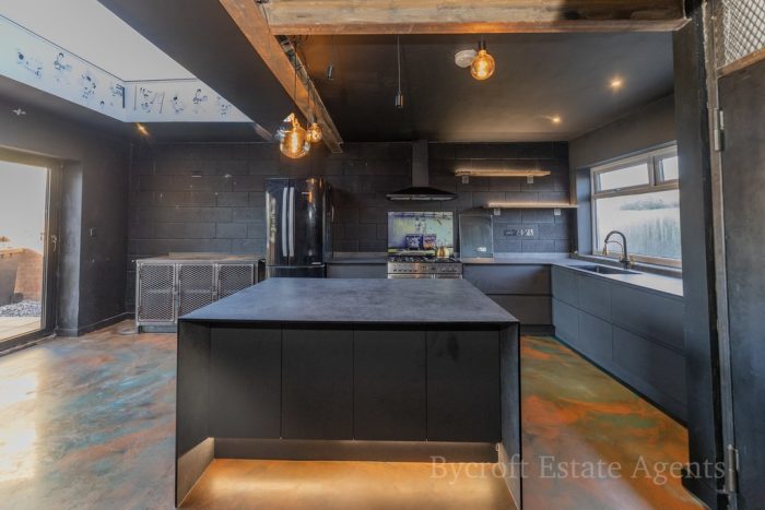 KITCHEN DINER BREAKFAST ROOM 20' 6" x 15' 6" (6.25m x 4.72m) large L-shaped worktop, range of drawers under, Range Master oven; large 1 bowl sink with mixer tap; island/breakfast bar; storage cupboards; space for American style fridge freezer; steel double doors to shelved utility/pantry cupboard; space and plumbing for washing machine; window to front aspect; bi-folding doors to the rear; large lantern light; door through to;