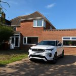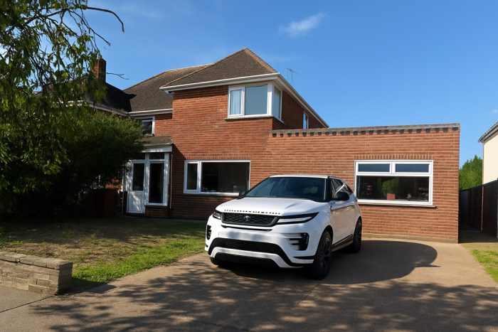 OUTSIDE to the front a driveway with space for two cars standing, half way round to rear, west facing garden, paved patio, lawn, mature shrubs, plants and trees, outside lighting.