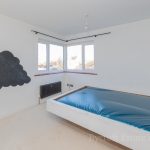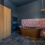 BATHROOM feature freestanding bath, black mixer tap and shower attachment; wash hand basin, mixer tap; wc with push button cistern; shower cubicle with mains black matt fittings, two shower heads; frosted double glazed window; black matt heated towel rail; extractor fan.
