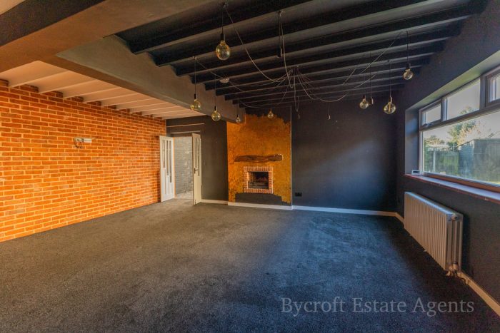 LOUNGE 22' 5 max" x 20' 4" (6.83m x 6.2m) with open fire; side windows; feature brick wall; radiator; double doors to;
