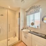 EN-SUITE 10' 1 max" x 7' 3 max" (3.07m x 2.21m) fitted with a white suite, comprising panelled bath and mixer tap over; low level wc; vanity wash hand basin with mixer tap over and storage cupboard below; walk in shower cubicle, shower screen, door, wall mounted shower unit; tiled splash backs; shaver point; heated towel rail; UPVC triple glazed window to rear; heated towel rail radiator.