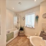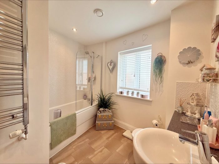 JACK & JILL BATHROOM 8' 2 max" x 9 max' (2.49m x 2.74m) fitted with a white suite comprising of a panel bath, shower screen and shower mixer over; low level wc; vanity hand wash basin, mixer tap over; storage cupboard below; UPVC triple glazed window to front and heated towel rail radiator.