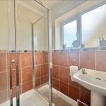 SHOWER ROOM 6' 6" x 5' 4" (1.98m x 1.63m) fitted with a shower en suite comprising of pedestal hand wash basin, walk in shower cubicle, sliding shower screen door, wall mounted electric shower unit; fully tiled walls; wall mounted bathroom cabinet; UPVC double glazed window to side.