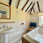 BATHROOM 8' 7 max" x 4' 6 max" (2.62m x 1.37m) with double-glazed window to rear; fitted with bathroom suite comprising of pedestal hand wash basin; low level wc and panel bath with shower mixer over; tiled splashbacks; shaver point; exposed timber beams.