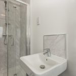ENSUITE SHOWER ROOM shower cubicle; wash hand basin; wc; front window; Aqua board walls; choice of finish for early reservations.