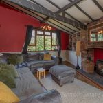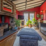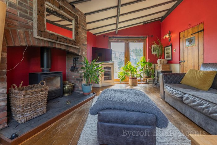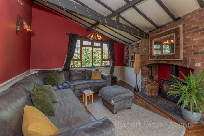 LOUNGE 17' 11 max" x 15' 9 max" (5.46m x 4.8m) of irregular shape; UPVC double glazed window to front; UPVC double glazed French door to side; feature fireplace with pamment hearth, inset wood burning stove and decorative brick surround.