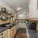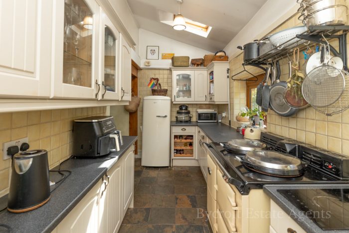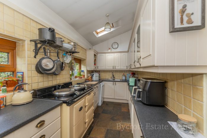 KITCHEN 17' 9" x 6' 5" (5.41m x 1.96m) fitted with a range of wall and base units with rolled edge work surfaces over; stainless steel 1½ bowl sink with mixer tap over inset; Aga Range cooker; plumbing for dishwasher; tiled splash backs; two roof light windows to side; two UPVC double glazed windows to side.