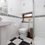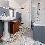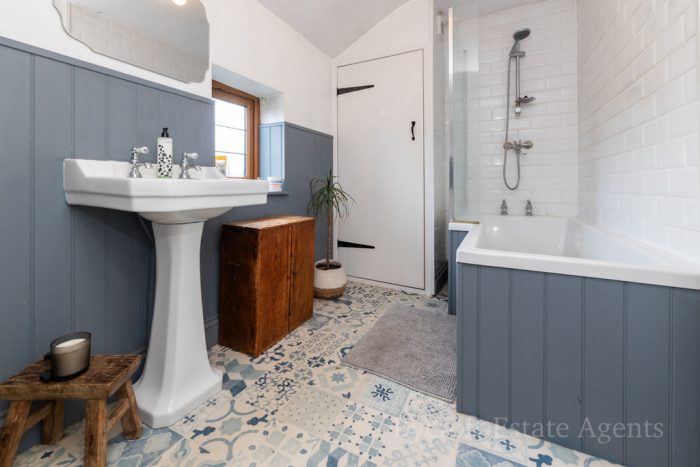 UPSTAIRS BATHROOM 12' 4 max" x 6' 1 max" (3.76m x 1.85m) fitted with a white suite comprising low level wc; pedestal wash hand basin; panel bath with shower screen and wall mounted shower unit over; built-in central heating boiler cupboard.