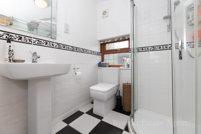 SHOWER ROOM 5' 10" x 6' 4" (1.78m x 1.93m) fitted with white suite comprising of a pedestal wash hand basin; low level wc; corner quadrant shower cubicle with sliding shower screen doors, wall mounted electric shower unit; tiled splashbacks extractor fan; shave point; heated towel rail; radiator.