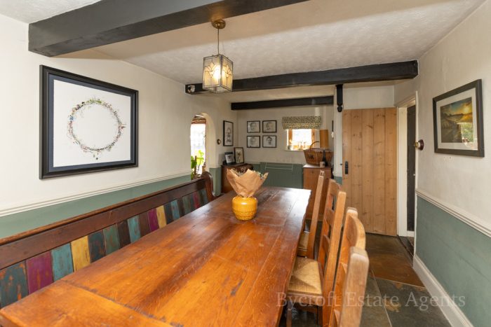 DINING ROOM 17' 10" x 9' 7 max" (5.44m x 2.92m) UPVC double glazed window to front; exposed timber beams; UPVC double glazed window to rear.