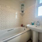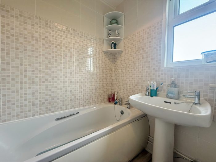 BATHROOM 6' 1 max" x 5' 4 max" (1.85m x 1.63m) fitted with a white suite comprising of close coupled wc; pedestal hand wash basin; panel bath with wall mounted electric shower unit over; fully tiled walls; UPVC double glazed window to rear.