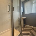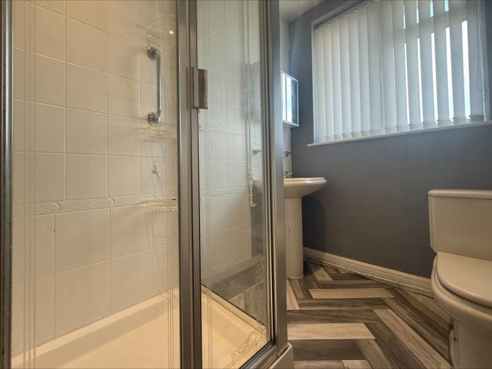 SHOWER ROOM 7' 10" x 5' 4" (2.39m x 1.63m) fitted with a white suite comprising of low level wc, pedestal hand wash basin; walk in shower cubicle, bi-folding shower screen door, wall mounted electric shower unit; tiled splashbacks; UPVC double glazed window to rear.