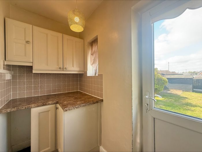 UTILITY 8' 2" x 3' 11" (2.49m x 1.19m) fitted with a range of wall and base units, square edge work surfaces, tiled splashbacks; UPVC double glazed window and door to rear.