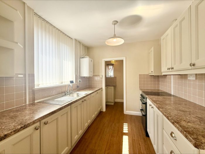 KITCHEN 9' 3" x 8' 2" (2.82m x 2.49m) fitted with range of wall and base units with square edge work surfaces over, tiled splashbacks; inset stainless steel 1½ bowl sink with mixer tap over; space for fridge freezer; electric cooker point, space for electric oven; wall mounted gas fired central heating boiler; plumbing for washing machine, UPVC double glazed window to side.