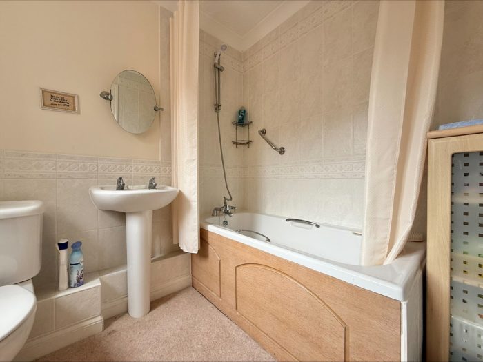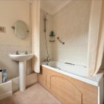 FAMILY BATHROOM 5' 11" x 7' (1.8m x 2.13m) fitted with a white suit comprising of pedestal hand wash basin; low level wc; panel bath with shower mixer over; tiled splashbacks; UPVC double glazed window to rear.