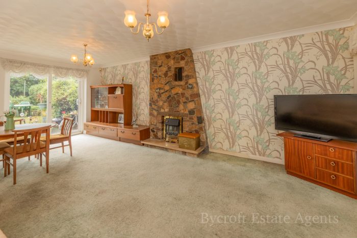LOUNGE/DINING ROOM 21' 3" x 13' 10 max" (6.48m x 4.22m) bay window to front aspect; sliding patio doors to rear; 2 radiators; York stone fireplace with electric fire; door into;