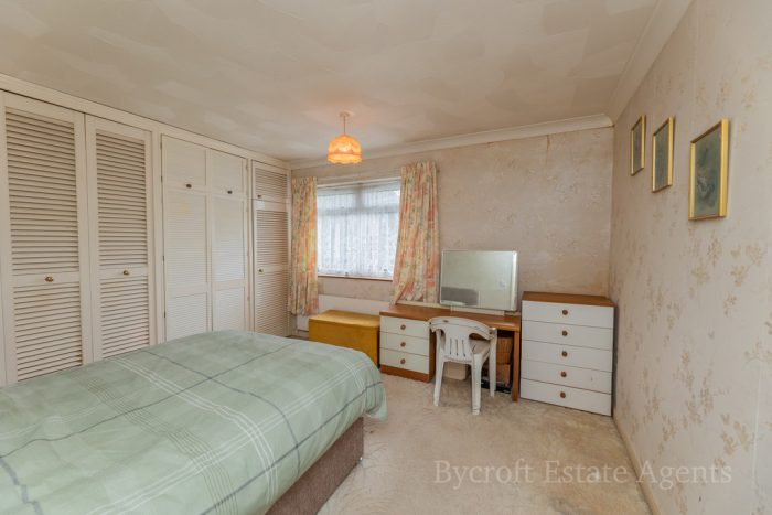 BEDROOM 3 10' 11 max" x 10' 2 + robes" (3.33m x 3.1m) triple built-in wardrobe, high level storage units over built-in shelved storage cupboard; window to front aspect; radiator.