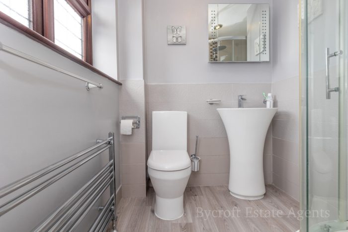 EN SUITE wc; hand wash basin; uPVC double glazed window to the front aspect; walk-in shower cubicle will wall mounted shower; heated towel rail.