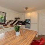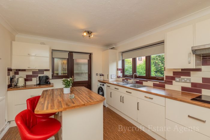 KITCHEN 14' 3" x 10' 5" (4.34m x 3.18m) uPVC double glazed windows to front and side aspect; uPVC double glazed door to side aspect; modern fitted kitchen with a mixture of wall and base units; integrated hob with extractor hood above; integrated oven, dishwasher and fridge; island with breakfast bar; central heating boiler house within kitchen.