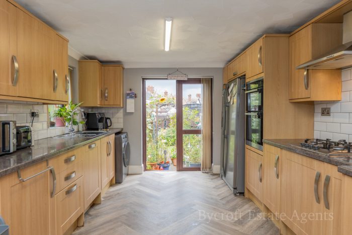 KITCHEN/DINER 20' 3" x 10' 7" (6.17m x 3.23m) fitted kitchen with mixture of wall and base units; integrated gas hob with extractor hood above; integrated sink drainer; integrated dishwasher; space for washing machine and American style fridge freezer; windows to both side aspects; double glazed double doors to rear aspect leading out to rear garden.