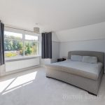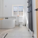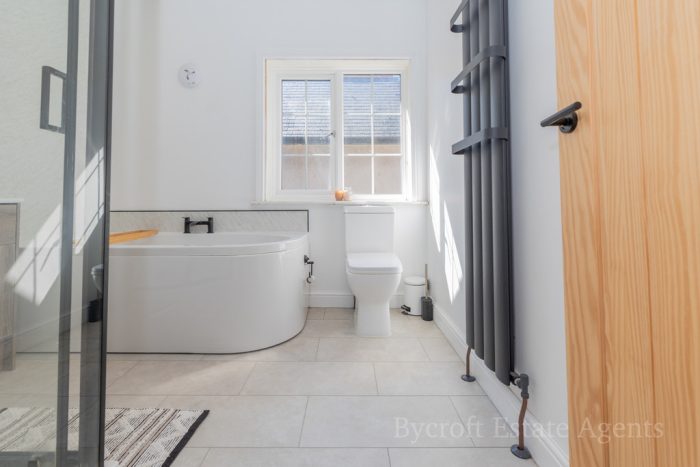 FAMILY BATHROOM large shower cubicle; two shower heads; vanity unit comprising wash hand basin, black matte mixer tap, storage cupboard under; bath with matte black mixer tap; wc with push button cistern; upvc double glazed side window; down lights; extractor fan; modern black matter radiator/towel rail.