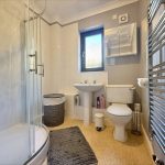 SHOWER ROOM 8' 5 max into door " x 6' 5 max" (2.57m x 1.96m) fitted with a white suite comprising low level wc; pedestal wash hand basin and corner quadrant shower cubicle with sliding shower screen doors and wall mounted shower unit; tiled splashbacks; shave point; uPVC double glazed window to side; extractor fan and heated towel rail radiator.