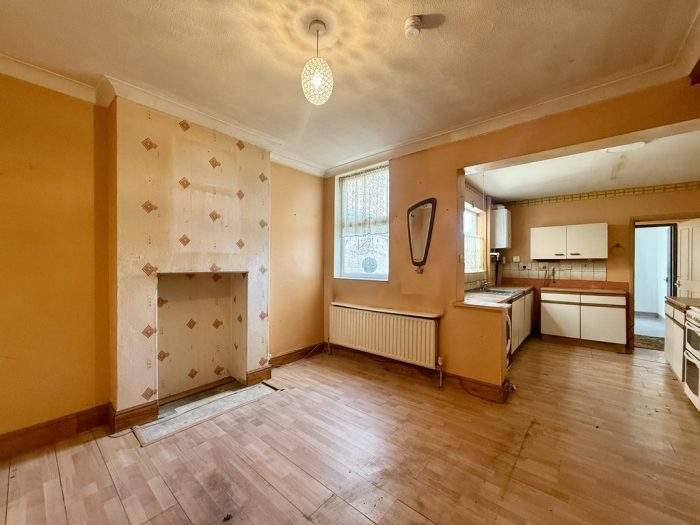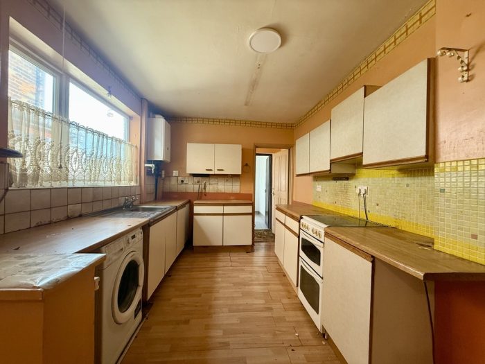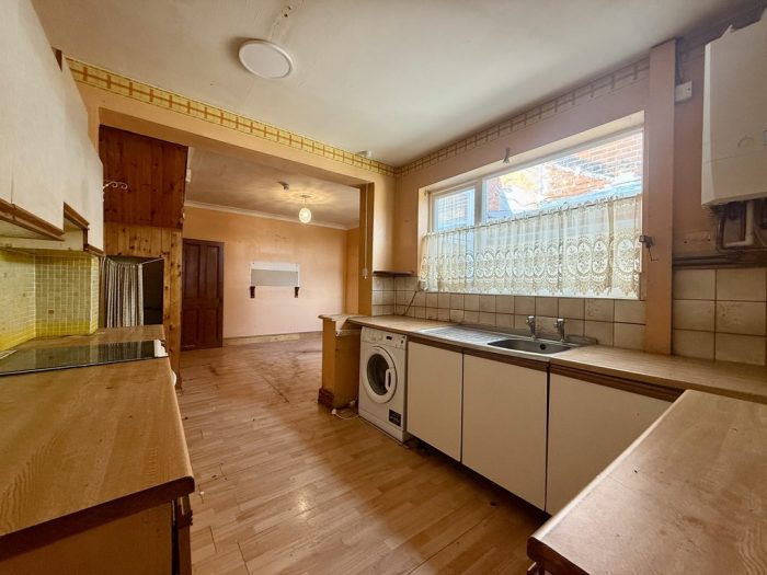 KITCHEN DINER 22' 3 max" x 14' 1 max" (6.78m x 4.29m) under stairs storage space; worktops, base cupboards and drawers space and plumbing for washing machine; space for oven; 1 bowel sink; wall units; Ideal gas boiler; windows to front and side aspect; radiator; door to;