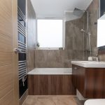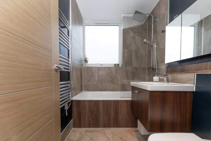 BATHROOM 7' 2" x 5' 6" (2.18m x 1.68m) fitted with a white suite comprising of low level wc; vanity hand wash basin, mixer tap over, storage drawer below; bath with mixer tap and wall mounted shower unit over, shower with soaker and hand attachments; tiled splashbacks; upvc double glazed window to front; extractor fan; heated towel rail radiator.