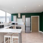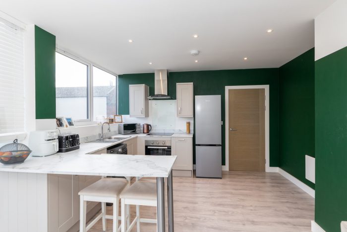 KITCHEN AREA fitted with a modern range of wall and base units with square edge work surfaces over; inset stainless steel single drainer sink with directional mixer tap over; built in electric oven; inset electric induction hood with cooker hood over; double glazed window to front; peninsular breakfast bar; space for fridge freezer.