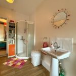 BATHROOM shower cubicle, mains shower fittings; pedestal wash hand basin, mixer tap; bath with mixer tap; wc with push button cistern; two frosted double glazed windows; two radiators; extractor fan.