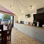 KITCHEN/BREAKFAST ROOM 15' 3" x 10' 9" (4.65m x 3.28m) recently fitted kitchen; large u-shaped worktop; range of base cupboards & drawers under; including integrated dish washer; pan drawers; two eye level ovens; space for an American Style fridge freezer; five ring induction hob with matching light & extractor; black one bowl sink with mixer tap; TV point; bi folding doors to rear garden; sloping ceiling.