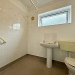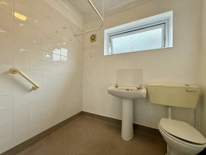 WET ROOM Mira shower fittings and soak away drainage; pedestal wash hand basin; wc; radiator; frosted double glazed window; extractor fan.