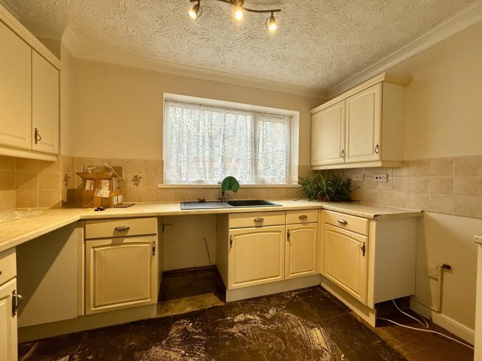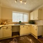 KITCHEN 11' 0" x 6' 9" (3.35m x 2.06m) u-shaped worktop; range of base cupboards and drawers; including space and plumbing for washing machine; space for oven; space for upright fridge freezer; one bowl sink with mixer tap; range of wall units; window to front aspect.