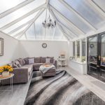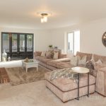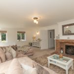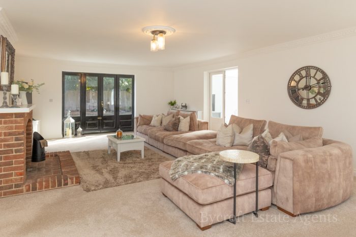 SITTING ROOM 28' 7" x 17' 4" (8.71m x 5.28m) two double glazed windows to front and double glazed window to side; French door to rear flanked by two double glazed windows to rear and French door to conservatory; feature fireplace with decorative brick surround and hearth mantle piece and inset open fire.