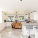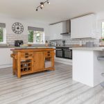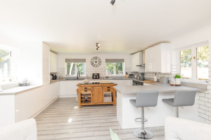 KITCHEN 25' 3" x 16' (7.7m x 4.88m) fitted with a stylish range of wall and base units with square edge work surfaces over, inset 1½ bowl single drainer sink with directional mixer tap over; integrated fridge, freezer and dishwasher; 2 electric ovens with inset 4 ring electric hob, cooker hood over; tiled splashbacks; double glazed windows to front and both side aspects; composite double glazed door to side.