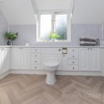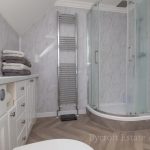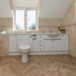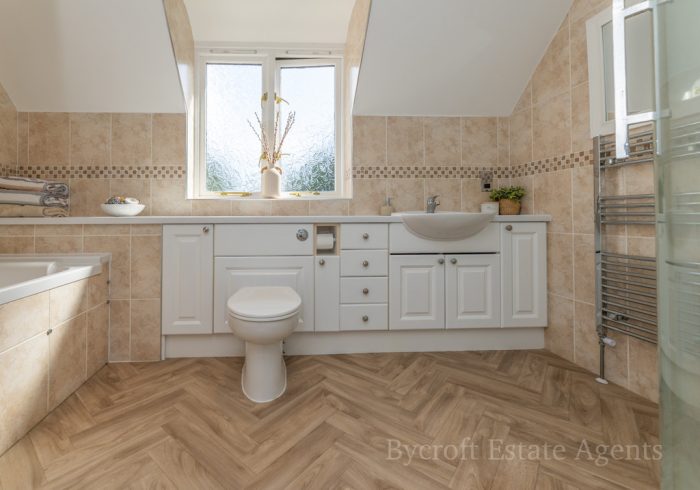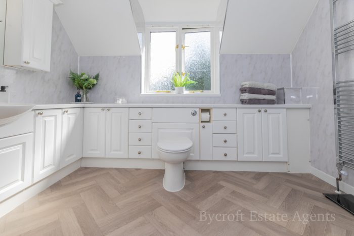 FAMILY BATHROOM 11' 4" x 7' 5" (3.45m x 2.26m) fitted with bathroom suite comprising of panel with mixer tap, separate shower attachment; low level wc; vanity wash hand basin with storage cupboards and drawers below; corner quadrant shower cubicle with shower screen door, wall mounted shower unit; fully tiled walls; shaver point; double glazed window to rear; heated towel rail radiator.